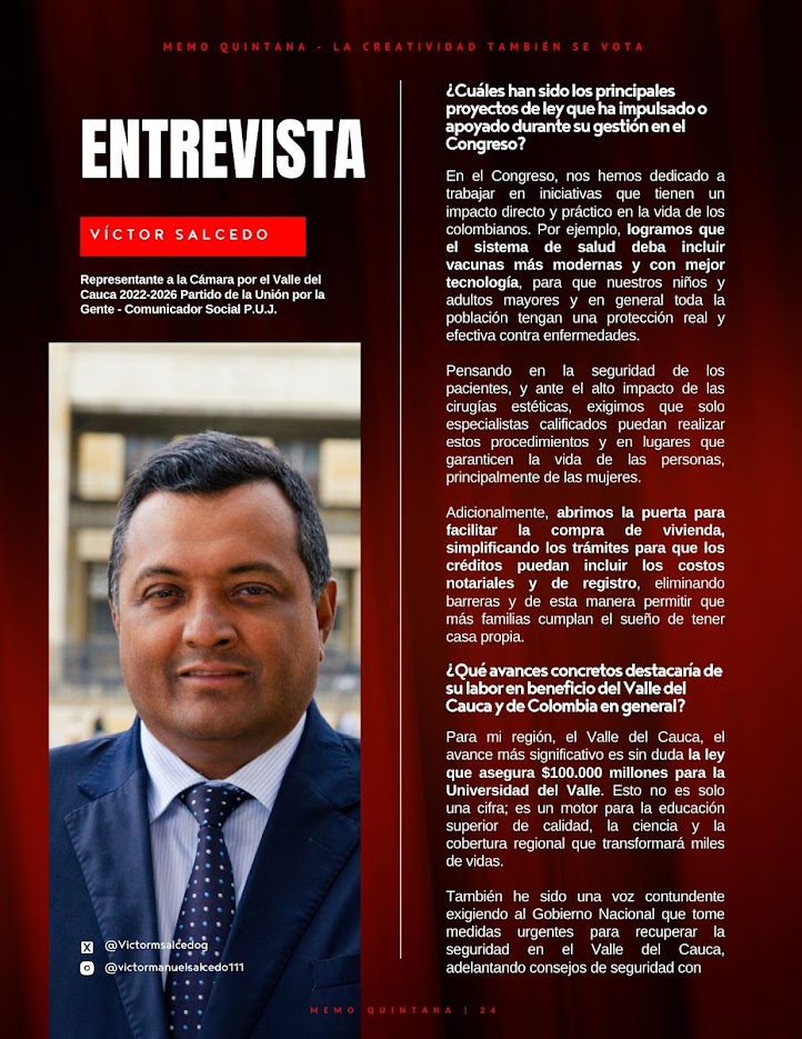 Entrevista Sufragio: Víctor Salcedo – Representante a la Cámara por el Valle del Cauca La política cobra sentido cuando las decisiones que se toman en el Congreso se traducen en beneficios tangibles para la ciudadanía. Bajo esa premisa, el congresista Víctor Manuel Salcedo ha orientado su gestión hacia iniciativas que buscan transformar la vida de los colombianos: desde fortalecer el sistema de salud con vacunas de última generación, facilitar el acceso a la vivienda y defender la autonomía ambiental, hasta garantizar recursos históricos para la Universidad del Valle. Con…