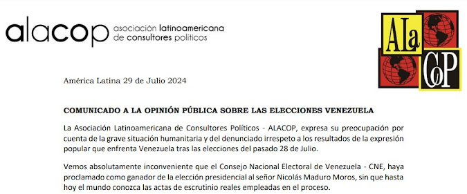 La Asociación Latinoamericana de Consultores Políticos − ALACOP, expresa su preocupación por cuenta de la grave situación humanitaria y del denunciado irrespeto a los resultados de la expresión popular que enfrenta Venezuela tras las elecciones del pasado 28 de Julio.
