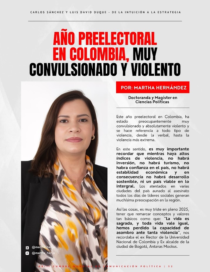 Año preelectoral en Colombia, muy convulsionado y violento Por: Martha Hernández Doctoranda y Magíster en Ciencias Políticas Este año preelectoral en Colombia, ha estado preocupantemente muy convulsionado y absolutamente violento y se hace referencia a todo tipo de violencia, desde la verbal, hasta la violencia más extrema. En este sentido, es muy importante recordar que mientras haya altos indices de violencia, no habrá inversion, no habrá turísmo, no habra confianza en el país, no habra estabiliddad económica y en consecuencia no habra desarrollo sostenible, ni un país viable en lo…