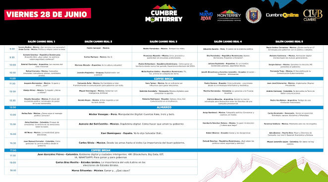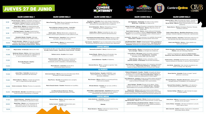 A través de sus redes sociales y plataforma online, los organizadores de la Cumbre de Comunicación Política han dado a conocer el cronograma de actividades para la vigésima edición del evento, que se llevará a cabo del 26 al 28 de junio en las instalaciones del Hotel Camino Real. Este año marca la segunda ocasión en que la cumbre se desarrolla en Monterrey.