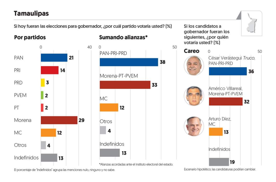 Redacción | Nacional 08.02.2022 El precandidato a gobernador por la alianza “Va por Tamaulipas”, César TruKo Verástegui se posiciona como el favorito de la ciudadanía para las próximas elecciones de este 2022, de acuerdo a encuesta de El Financiero. El “TruKo” Verástegui con 36 por ciento de intención de voto, le saca una diferencia a su contrincante más cercano que se presume sería Américo Villareal, abanderado de Morena. La encuesta publicada por el Financiero también muestra como tercer candidato a Arturo Diez, que estaría encabezando a Movimiento Ciudadano.…