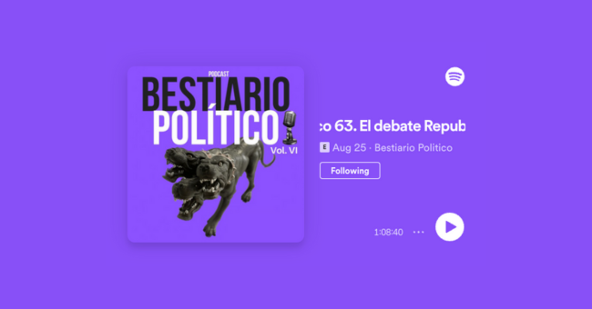 Podcast | Bestiario PolíticoOswaldo Ramírez y Edgard Gutierrez En este episodio fijamos nuevamente la mirada en lo que sucede en la política electoral norteamericana, específicamente en la del partido Republicano. Con el inicio forma de la temporada de primarias que es marcado por la celebración de su primer debate de aspirantes en Milwaukee, la carrera por la nominación del GOP es ampliamente dominada por Donald J. Trump. El expresidente y gran favorito en los sondeos, se dio el lujo de no asistir a ese encuentro organizado por el RNC y…