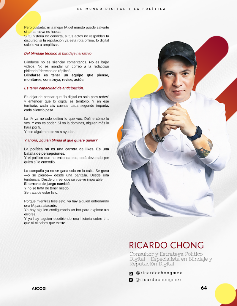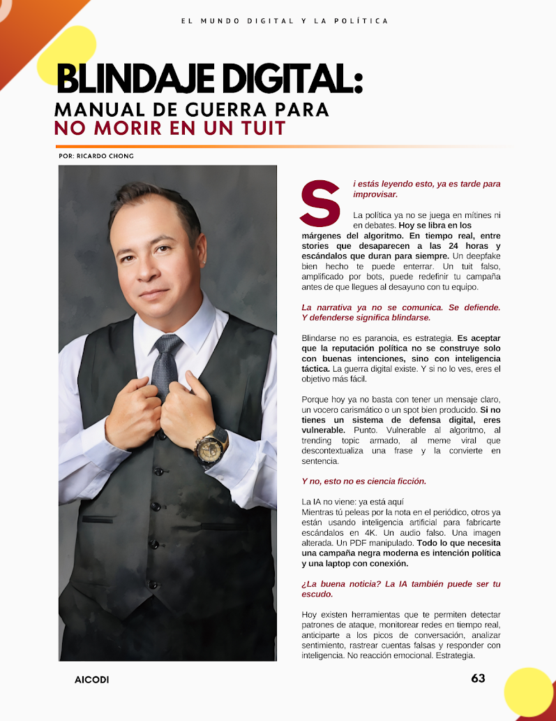 Blindaje Digital: Manual de Guerra para No Morir en un Tuit Por: Ricardo Chong 📍 Si estás leyendo esto, ya es tarde para improvisar. La política ya no se juega en mítines ni en debates. Hoy se libra en los márgenes del algoritmo. En tiempo real, entre stories que desaparecen a las 24 horas y escándalos que duran para siempre. Un deepfake bien hecho te puede enterrar. Un tuit falso, amplificado por bots, puede redefinir tu campaña antes de que llegues al desayuno con tu equipo. La narrativa ya no…