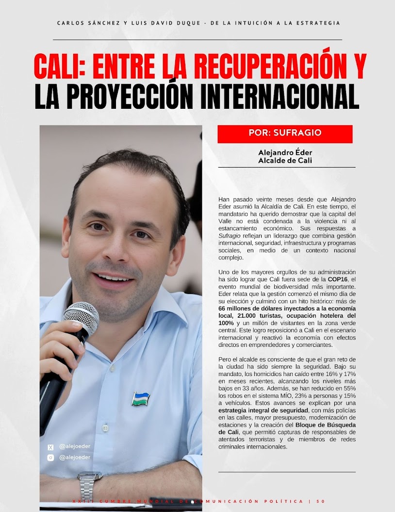 Cali: entre la recuperación y la proyección internacional Han pasado veinte meses desde que Alejandro Eder asumió la Alcaldía de Cali. En este tiempo, el mandatario ha querido demostrar que la capital del Valle no está condenada a la violencia ni al estancamiento económico. Sus respuestas a Sufragio reflejan un liderazgo que combina gestión internacional, seguridad, infraestructura y programas sociales, en medio de un contexto nacional complejo. Uno de los mayores orgullos de su administración ha sido lograr que Cali fuera sede de la COP16, el evento mundial de biodiversidad…