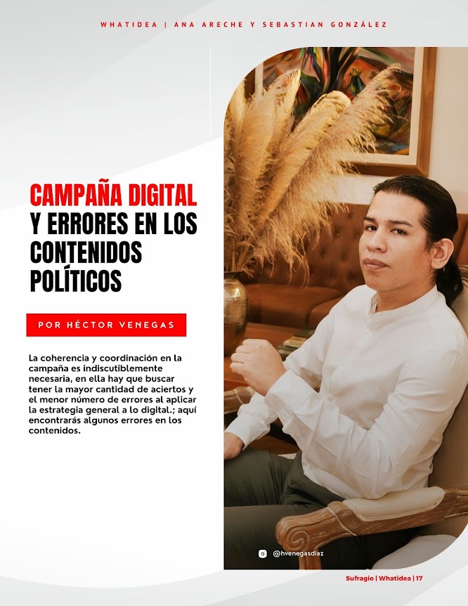 Por: Héctor Venegas La coherencia y coordinación en la campaña es indiscutiblemente necesaria, en ella hay que buscar tener la mayor cantidad de aciertos y el menor número de errores al aplicar la estrategia general a lo digital.; aquí encontrarás algunos errores en los contenidos. Oficial: Esta es la plataforma principal del candidato, por lo que cometer errores aquí pueden afectar seriamente la percepción pública y falta de conexión entre el candidato y el votante. Ausencia de una narrativa clara con contenidos que desarrollen el storytelling, arquetipo, mensajes y…