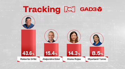Entretanto, en la Sucursal del Cielo, la distancia entre el principal opcionado, Roberto Ortiz, más conocido como El Chontico, y el segundo en las preferencias de los encuestados, Alejandro Éder, aumentó. Según el Tracking de RCN, Ortiz tiene el 43,6%, ante un 15,4% de Éder; mientras que en el tercer lugar se ubica la exconcejal Diana Rojas (14,3%) y la exsecretaria de Salud de la ciudad Miyerlandi Torres (8.5%).