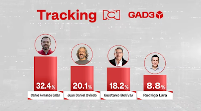 De acuerdo con el sondeo, Galán lidera con un 32,4% del apoyo de los encuestados, frente a un 20,1% del exdirector del Dane Juan Daniel Oviedo; que parece haber repuntado en su favoritismo con miras a la contienda. En el tercer lugar se ubica, según esta medición, Gustavo Bolívar (18,2%), mientras que en el cuarto puesto aparece Rodrigo Lara (8,8%).
