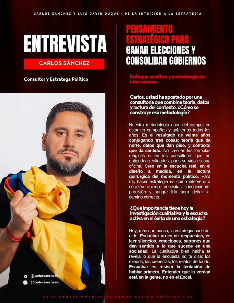 Carlos Sánchez, pensamiento estratégico para ganar elecciones y consolidar gobiernos En un contexto político latinoamericano cada vez más complejo, la consultoría política exige precisión, ética y un profundo entendimiento de la sociedad. Carlos, referente en la región, comparte con Sufragio su visión sobre cómo construir estrategias efectivas a partir de la combinación de teoría, datos y lectura del contexto. Desde la importancia de la investigación cualitativa y la escucha activa, hasta los retos de los gobiernos frente a la desafección ciudadana y la polarización, sus reflexiones abarcan la práctica cotidiana,…