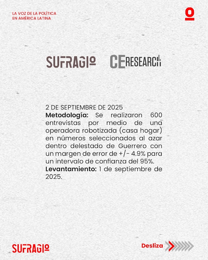 CE Research presentó una nueva encuesta estatal realizada el 2 de septiembre, enfocada en medir la intención de voto y las preferencias políticas rumbo a la elección de gobernador de Guerrero en 2027. El estudio analiza la identificación partidaria de los ciudadanos, las preferencias dentro de Morena y sus aliados, así como la postura de la oposición y las posibles alianzas entre PRI y PAN. Además, incluye la intención de voto si la elección se realizara hoy, ofreciendo un panorama preliminar de la competitividad electoral en el estado.