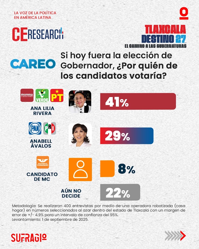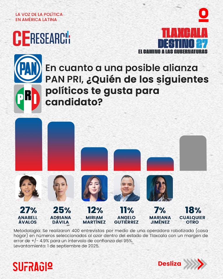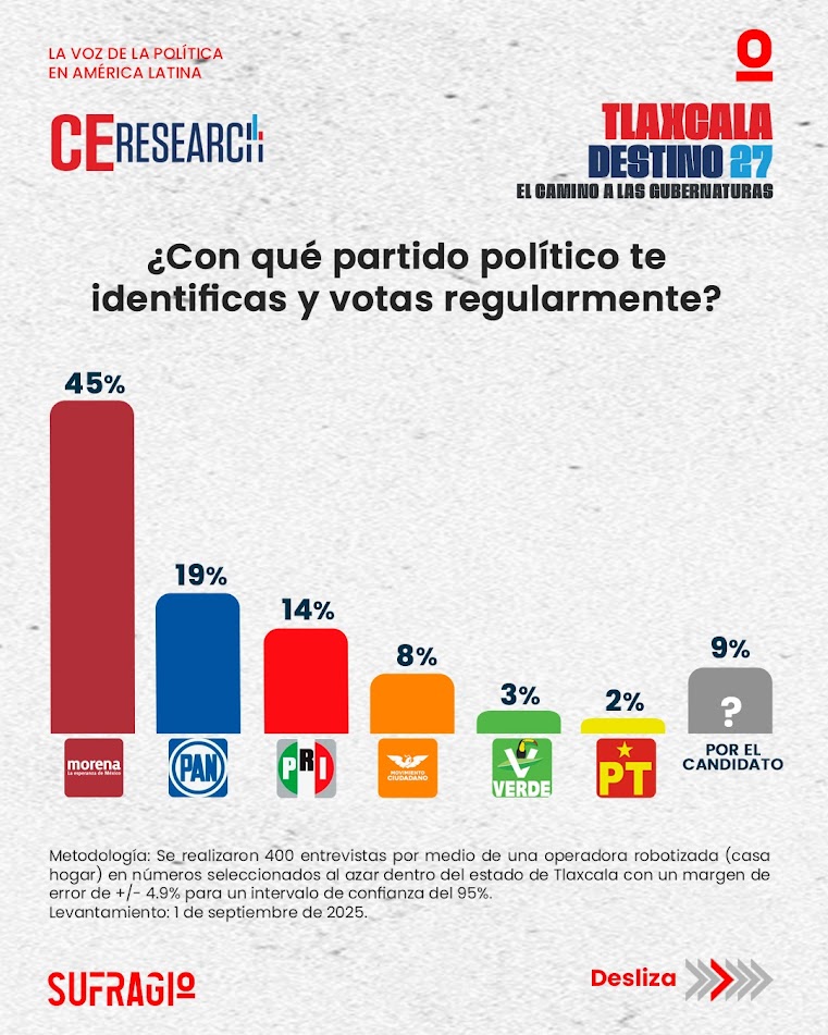 CE Research presenta los resultados de su más reciente encuesta rumbo a la gubernatura de Tlaxcala, ofreciendo un panorama sobre la opinión ciudadana en torno a partidos, aspirantes y posibles alianzas electorales.