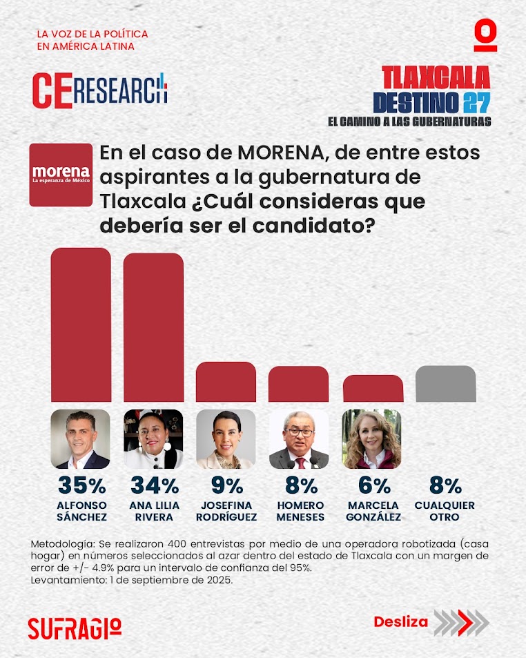 CE Research presenta los resultados de su más reciente encuesta rumbo a la gubernatura de Tlaxcala, ofreciendo un panorama sobre la opinión ciudadana en torno a partidos, aspirantes y posibles alianzas electorales. En cuanto a identificación partidista, la mayoría se inclina por Morena, seguida por PAN, PRI y Movimiento Ciudadano, mientras que algunos votan por otros partidos o por el candidato sin importar su afiliación. Entre los aspirantes de Morena, Alfonso Sánchez y Ana Lilia Rivera lideran las preferencias, seguidos por Josefina Rodríguez, Homero Meneses y Marcela González. Frente a…