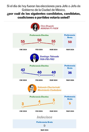 El debate entre los tres candidatos celebrado recientemente parece haber tenido poco impacto en las intenciones de voto de los capitalinos. A pesar de los intercambios de críticas más que de propuestas, las cifras muestran una estabilidad relativa en las preferencias. Si bien Brugada ha perdido un punto desde la encuesta de febrero, Taboada ha mantenido su posición en el 40%.