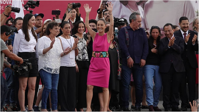 “Pido que digan conmigo: ‘¡Ni un paso atrás en la transformación! Vamos al encuentro con el pueblo de México. ¿Me van a acompañar en esta hazaña?” Entonces llegaron los aplausos y gritos de “¡presidenta!” de miles que llegaron en camiones, luego estacionados desde avenida Morelos hasta Garibaldi, y todos con calcomanías de #EsClaudia.