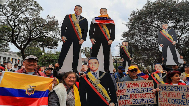 El presidente y candidato Daniel Noboa sorprendió con un mitin en la Plaza Grande de Quito bajo el lema “Defendamos al Ecuador, ¡no más pillos!”. Aunque el acto fue presentado como un apoyo a su gestión y no parte de su campaña oficial, las declaraciones y los simbólicos muñecos de cartón de Noboa dieron un claro guiño electoral. “En cinco semanas ganamos”, afirmó, dejando entrever sus intenciones de reelección.