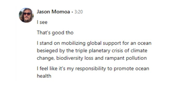 En entrevista, Momoa refirió que “está a favor de movilizar el apoyo mundial para un océano asediado por la triple crisis planetaria del cambio climático, la pérdida de biodiversidad y la contaminación desenfrenada”. En ese sentido piensa que es promover la salud de los océanos, porque el futuro de todos los seres vivos depende de ello.