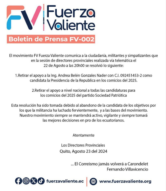 Ecuador En un comunicado oficial, el movimiento Fuerza Valiente anunció que ha decidido retirar su respaldo a la candidatura presidencial de Andrea González, de cara a las elecciones generales programadas para el 9 de febrero de 2025. El movimiento también informó que retira su apoyo a los candidatos de Sociedad Patriótica, con quienes habían establecido una alianza. La decisión afecta a todos los aspirantes que representarán a este partido en las próximas elecciones. El comunicado detalla que la decisión se basa en el incumplimiento de la candidata con los…