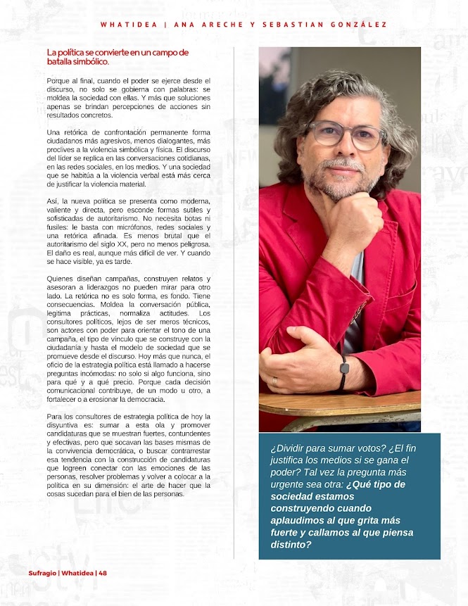 Quienes diseñan campañas, construyen relatos y asesoran a liderazgos no pueden mirar para otro lado. La retórica no es solo forma, es fondo. Tiene consecuencias. Moldea la conversación pública, legitima prácticas, normaliza actitudes. Los consultores políticos, lejos de ser meros técnicos, son actores con poder para orientar el tono de una campaña, el tipo de vínculo que se construye con la ciudadanía y hasta el modelo de sociedad que se promueve desde el discurso. Hoy más que nunca, el oficio de la estrategia política está llamado a hacerse preguntas incómodas: no solo si algo funciona, sino para qué y a qué precio. Porque cada decisión comunicacional contribuye, de un modo u otro, a fortalecer o a erosionar la democracia.