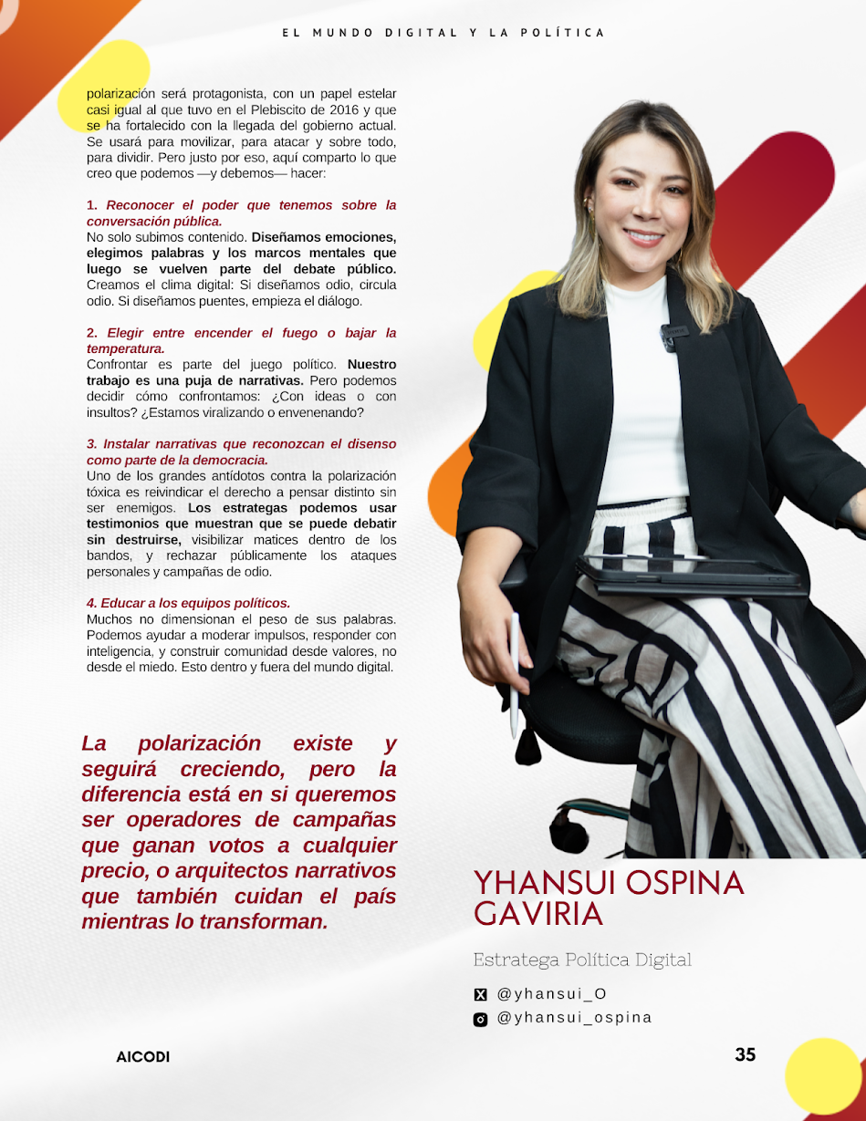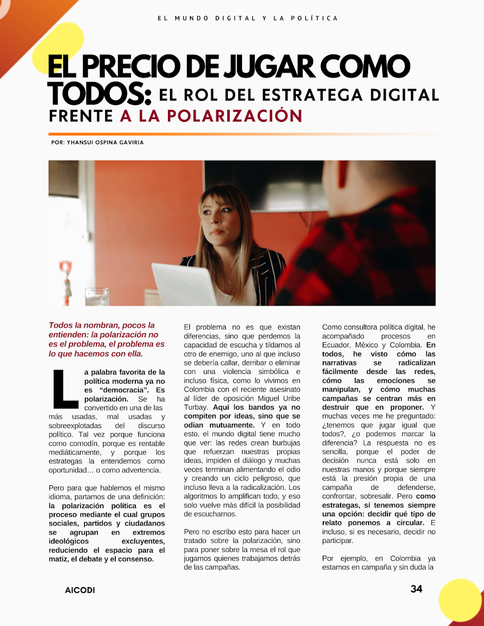 El precio de jugar como todos: el rol del estratega digital frente a la polarización Todos la nombran, pocos la entienden: la polarización no es el problema, el problema es lo que hacemos con ella.Yhansui Ospina Gaviria Estratega Política Digital La palabra favorita de la política moderna ya no es “democracia”. Es polarización.Se ha convertido en una de las más usadas, mal usadas y sobreexplotadas del discurso político. Tal vez porque funciona como comodín, porque es rentable mediáticamente, y porque los estrategas la entendemos como oportunidad… o como advertencia. Pero…