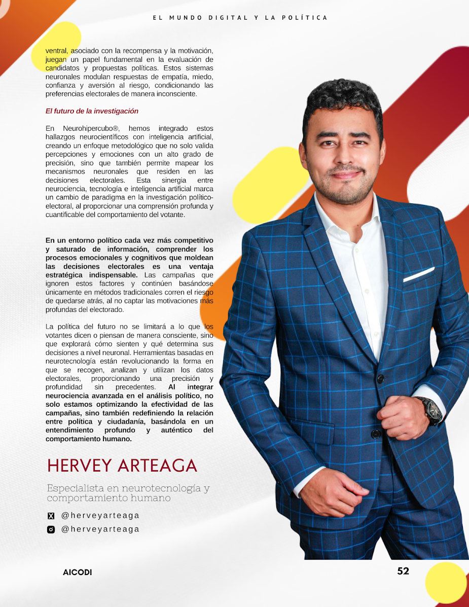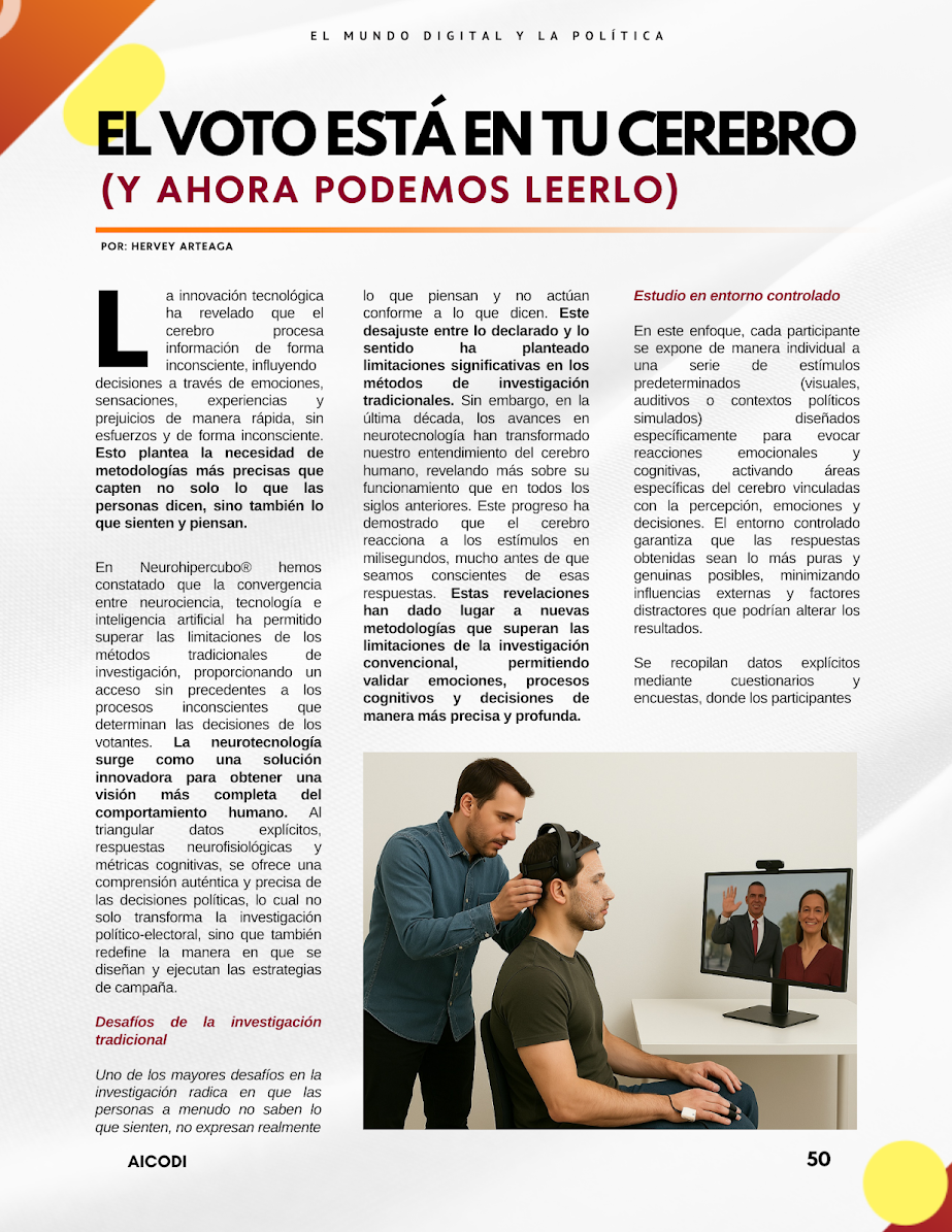 El voto está en tu cerebro (y ahora podemos leerlo) Por Hervey Arteaga La innovación tecnológica ha revelado que el cerebro procesa información de forma inconsciente, influyendo decisiones a través de emociones, sensaciones, experiencias y prejuicios de manera rápida, sin esfuerzos y de forma inconsciente. Esto plantea la necesidad de metodologías más precisas que capten no solo lo que las personas dicen, sino también lo que sienten y piensan. En Neurohipercubo® hemos constatado que la convergencia entre neurociencia, tecnología e inteligencia artificial ha permitido superar las limitaciones de los métodos…