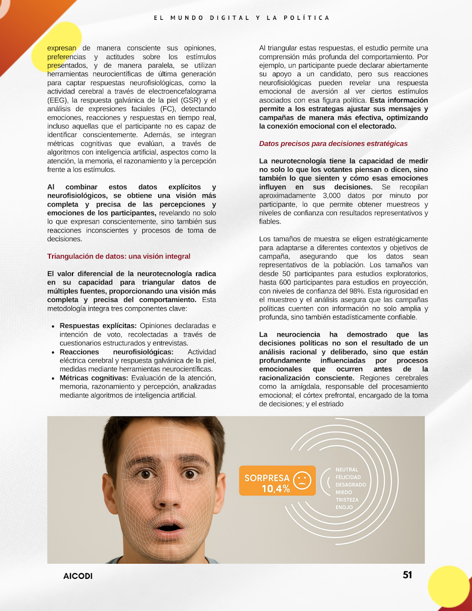 En Neurohipercubo® hemos constatado que la convergencia entre neurociencia, tecnología e inteligencia artificial ha permitido superar las limitaciones de los métodos tradicionales de investigación, proporcionando un acceso sin precedentes a los procesos inconscientes que determinan las decisiones de los votantes. La neurotecnología surge como una solución innovadora para obtener una visión más completa del comportamiento humano. Al triangular datos explícitos, respuestas neurofisiológicas y métricas cognitivas, se ofrece una comprensión auténtica y precisa de las decisiones políticas, lo cual no solo transforma la investigación político-electoral, sino que también redefine la manera en que se diseñan y ejecutan las estrategias de campaña.