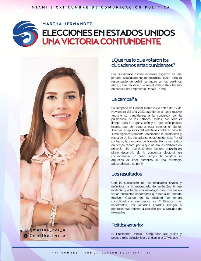 Martha Hernández es Doctoranda y Magíster en Ciencias Políticas, Comunicadora Social y Periodista. Directora Académica de la Cumbre Mundial de Comunicación Política. Colaboró en la estrategia de Comunicaciones en la campaña de una Diputada Nacional de Francia del partido del Presidente Emmanuel Macron; por lo que ganó el premio Napolitan Victory Awards como Consultora del año en un rol de apoyo. Reconocida en Harvard como una líder influyente. Premio Excelencia Académica Política 2024. Docente de la Maestría en Comunicación Política de IMF de España y la Universidad de los Hemisferios de Ecuador. Directora Editorial de varias revistas académicas en Latinoamérica. Jurado de los Polaris Awards de Inglaterra. Consultora en Ciencias Políticas y Comunicaciones con más de 24 años de experiencia profesional. Docente universitaria durante 10 años en Colombia y consultora experta de la Unión Europea.
