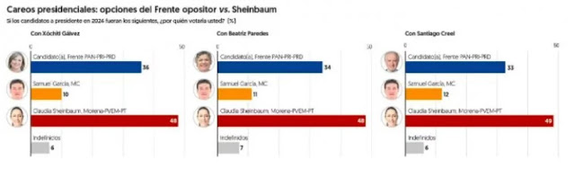 La encuesta muestra que en un hipotético enfrentamiento electoral contra Samuel García y Xóchitl Gálvez, Sheinbaum consigue un notable 48% de preferencia de voto, mientras que la representante del Frente Amplio alcanza un 36%, y el candidato de Movimiento Ciudadano, Samuel García, obtiene el 10% restante.