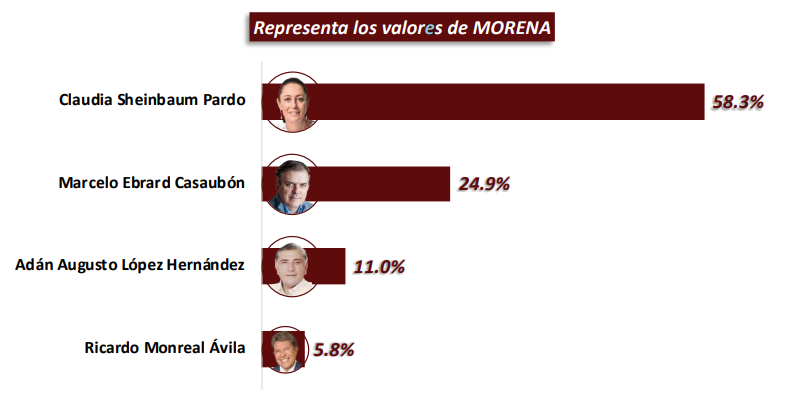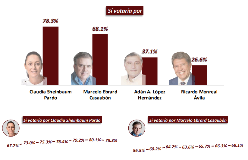 Según la encuesta de Facto Métrica sobre la imagen de los precandidatos presidenciales para 2024 de Morena describen de manera general que el grado de conocimiento de los postulados mantienen a Claudia Sheinbaum y Marcelo Ebrard en el primer lugar, con un crecimiento progresivo en los anteriores meses.