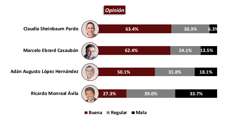 De la misma forma, Sheinbaum supera por un punto a Ebrad en la opinión “buena” en su reconocimiento social.