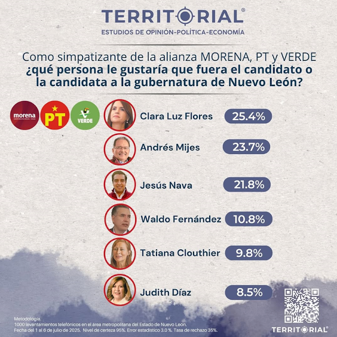 De acuerdo con los más recientes estudios de opinión de Territorial, realizados del 1 al 6 de julio de 2025 en el área metropolitana de Nuevo León, comienzan a perfilarse los nombres favoritos entre simpatizantes de los principales partidos y alianzas rumbo a la elección para la gubernatura del estado. En la alianza Morena-PT-Verde, Clara Luz Flores encabeza la intención de los simpatizantes con un 25.4%, seguida muy de cerca por Andrés Mijes con 23.7% y Jesús Nava con 21.8%, lo que refleja una contienda interna cerrada. Por parte de…
