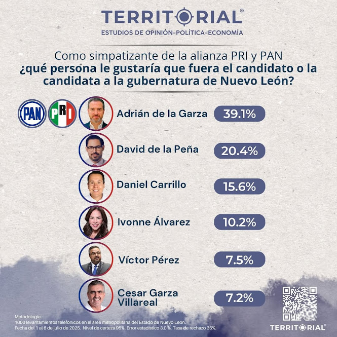 De acuerdo con los más recientes estudios de opinión de Territorial, realizados del 1 al 6 de julio de 2025 en el área metropolitana de Nuevo León, comienzan a perfilarse los nombres favoritos entre simpatizantes de los principales partidos y alianzas rumbo a la elección para la gubernatura del estado.