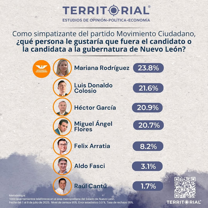 Por parte de Movimiento Ciudadano, la figura de Mariana Rodríguez se posiciona como la preferida con 23.8%, seguida por Luis Donaldo Colosio (21.6%), Héctor García (20.9%) y Miguel Ángel Flores (20.7%), mostrando un virtual empate técnico entre los principales perfiles.