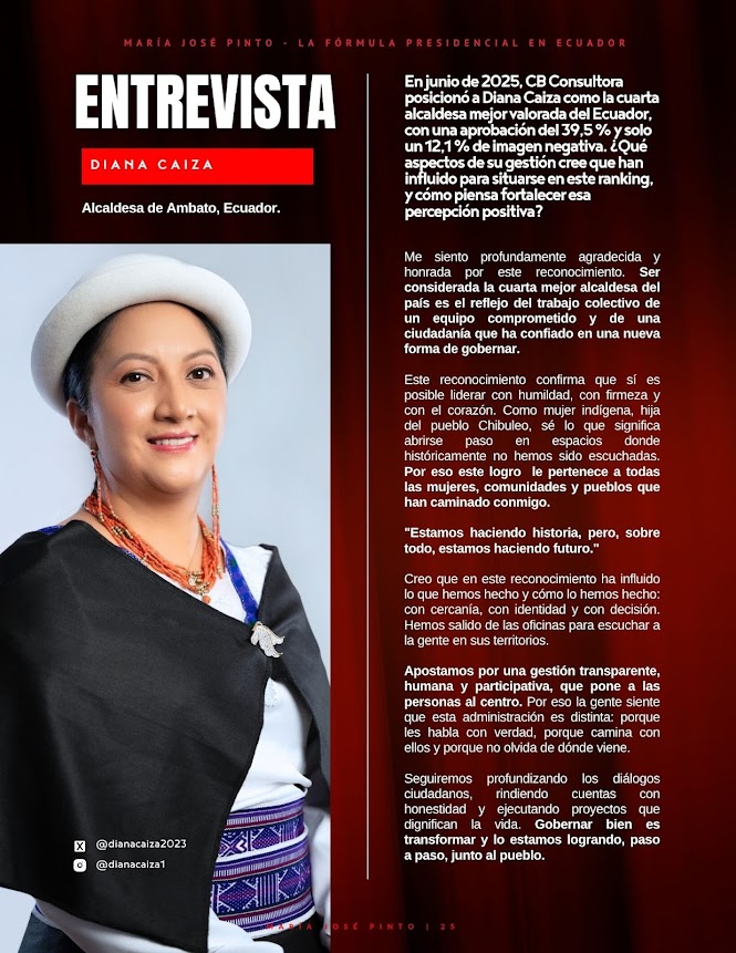 En junio de 2025, CB Consultora posicionó a Diana Caiza como la cuarta alcaldesa mejor valorada del Ecuador, con una aprobación del 39,5 % y solo un 12,1 % de imagen negativa. ¿Qué aspectos de su gestión cree que han influido para situarse en este ranking, y cómo piensa fortalecer esa percepción positiva?