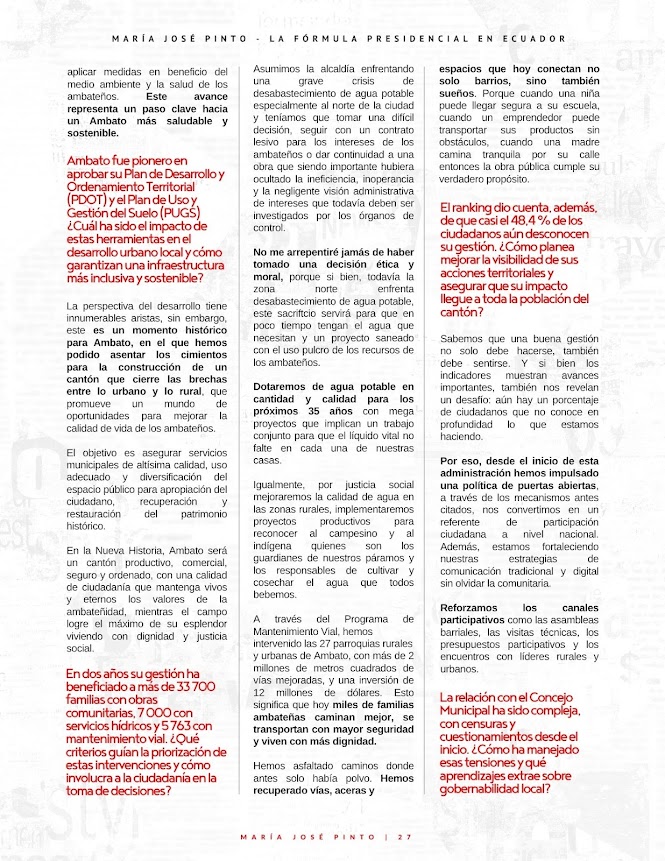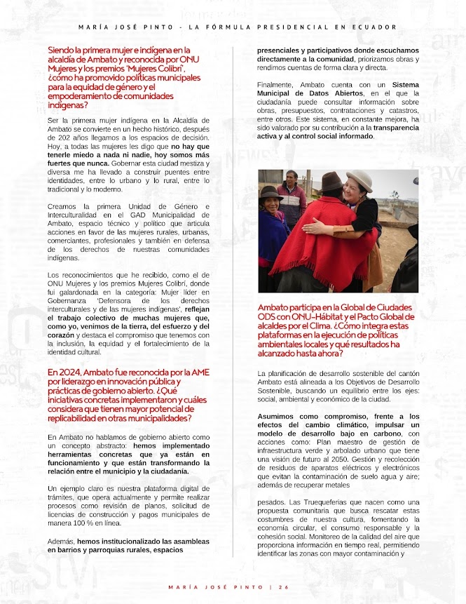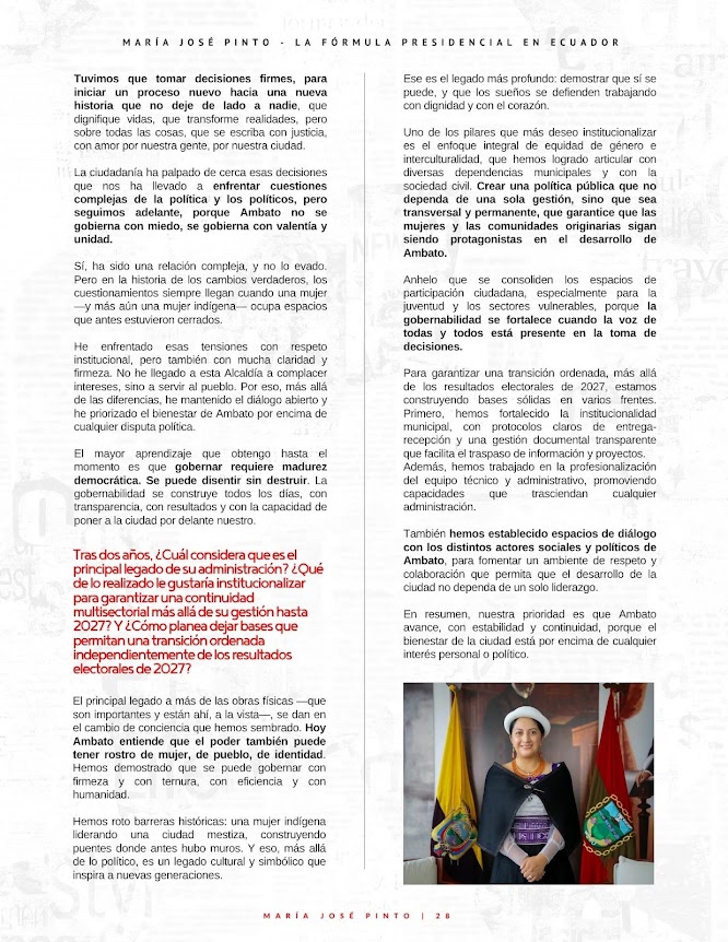 Ser la primera mujer indígena en la Alcaldía de Ambato se convierte en un hecho histórico, “Después de 202 años llegamos a los espacios de decisión. Hoy, a todas las mujeres les digo que no hay que tenerle miedo a nada ni nadie, hoy somos más fuertes que nunca”; es una responsabilidad profunda. Gobernar esta ciudad mestiza y diversa me ha llevado a construir puentes entre identidades, entre lo urbano y lo rural, entre lo tradicional y lo moderno.