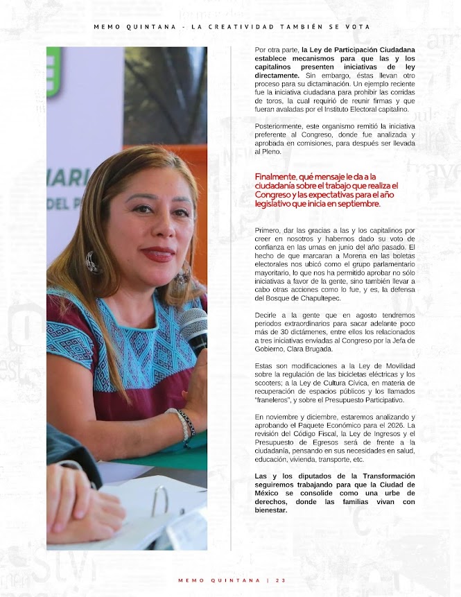 En el marco del cierre del primer año de la Tercera Legislatura del Congreso de la Ciudad de México, conversamos con la diputada Xóchitl Bravo Espinosa, coordinadora del grupo parlamentario de Morena, quien hace un balance de los principales logros, retos y perspectivas de su gestión. Desde la aprobación de reformas que impactan la seguridad, movilidad y derechos sociales, hasta la consolidación de mecanismos para la participación ciudadana, la diputada detalla las acciones que reflejan el compromiso de Morena con la Cuarta Transformación en la capital del país. Asimismo, aborda los desafíos políticos y los próximos pasos legislativos, ratificando el papel del Congreso como un espacio de diálogo y construcción para el bienestar de las y los capitalinos.