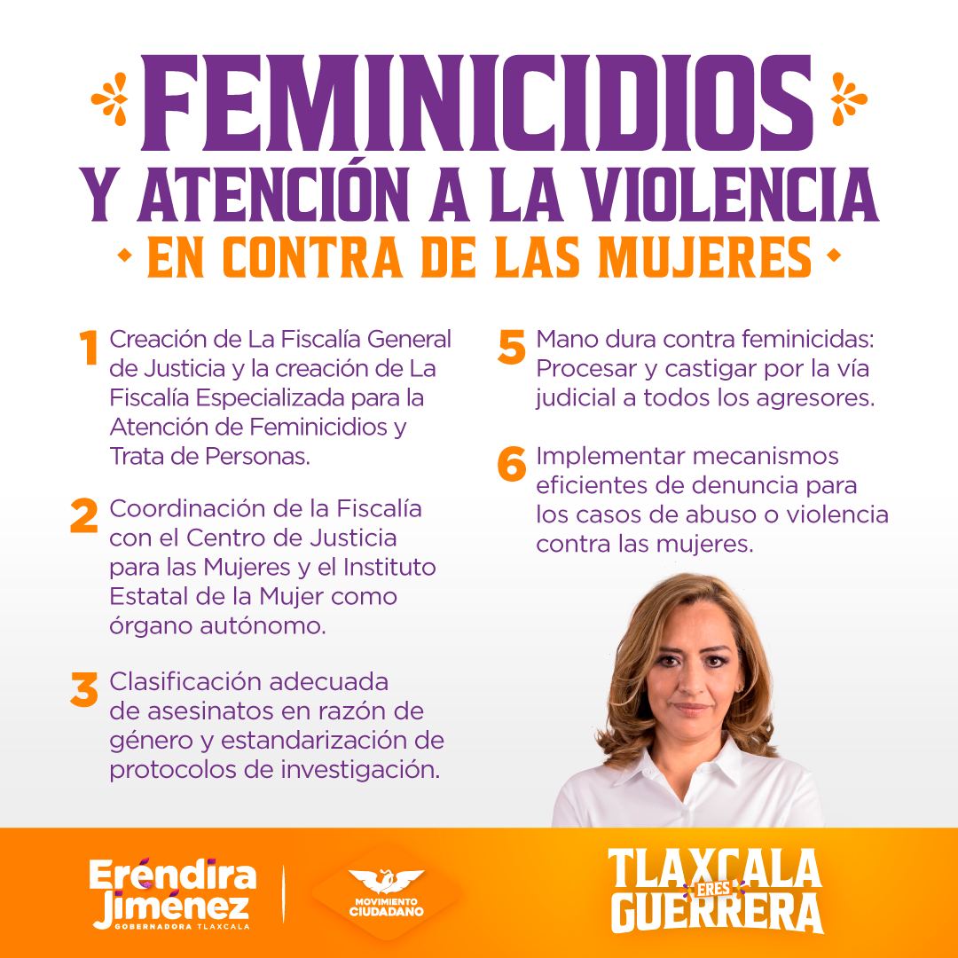 La candidata a la gubernatura de Tlaxcala por Movimiento Ciudadano quiere mostrar la fortaleza de la mujer, y su valor en la construcción y desarrollo del gobierno y la vida pública, pero desgraciadamente aún hay un alto nivel de violencia contra ellas, por lo que ideo una serie de propuestas encaminadas a proteger a la mujer de la violencia de género y los feminicidios.