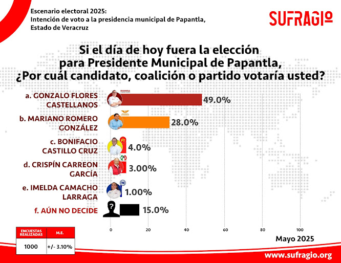 Escenario Electoral 2025: Intención de voto a la presidencia municipal de Papantla, estado de Veracruz