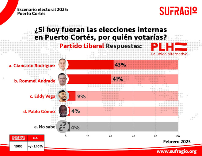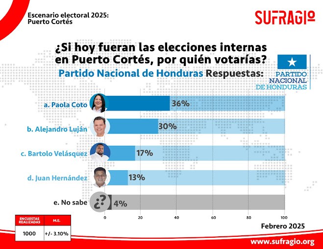 Honduras  Las elecciones internas de 2025 en Puerto Cortés se perfilan como una de las más competitivas en la historia reciente del municipio, según los resultados de la última encuesta publicada por Sufragio, Los datos revelan una cerrada disputa entre los principales partidos políticos del país: el Partido Nacional de Honduras (PNH), el Partido Libertad y Refundación (Libre), y el Partido Liberal. Pola Coto se posiciona a la cabeza con un 36% de intención de voto, superando por 6 puntos a su más cercano competidor, Alejandro Luján, quien obtiene el…