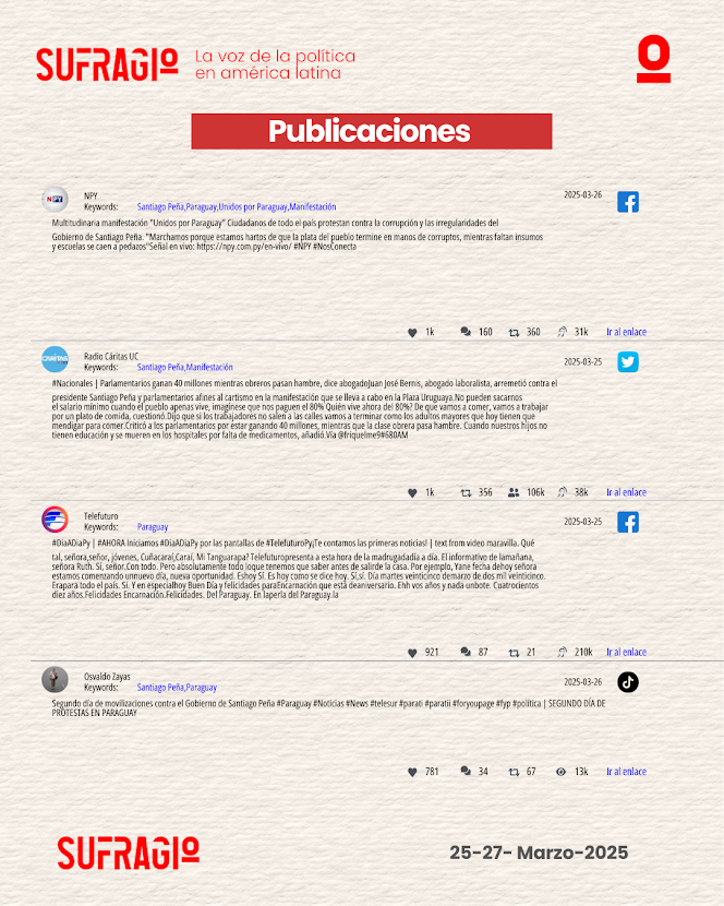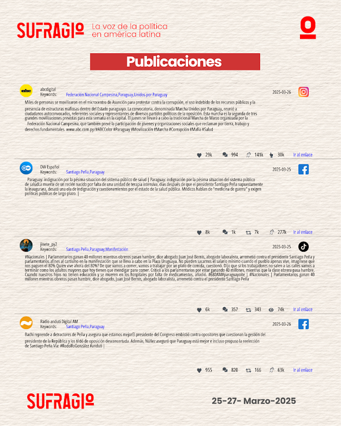 En las últimas semanas, Paraguay ha sido escenario de movilizaciones masivas que reflejan el creciente descontento social hacia el gobierno de Santiago Peña. Bajo el lema “Unidos por Paraguay”, diversas agrupaciones, incluidos jóvenes y campesinos, han exigido reformas agrarias y mejoras en la calidad de vida. Las manifestaciones han ganado fuerza, impulsadas por la percepción de corrupción y la falta de respuesta a las necesidades ciudadanas, un sentimiento ampliamente expresado en publicaciones que critican la situación económica y política del país. En este contexto, figuras políticas como Bachi Núñez han…