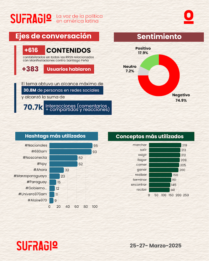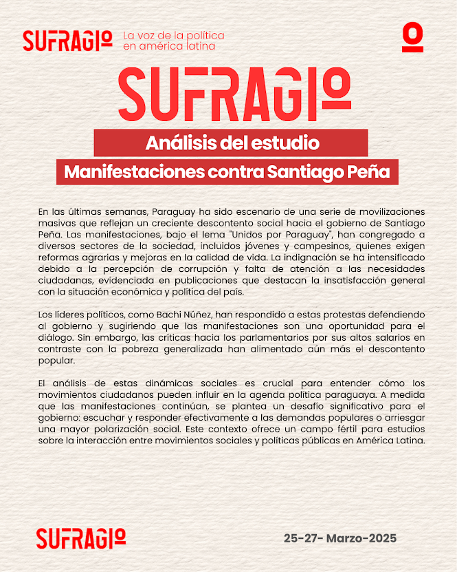 En las últimas semanas, Paraguay ha sido escenario de movilizaciones masivas que reflejan el creciente descontento social hacia el gobierno de Santiago Peña. Bajo el lema “Unidos por Paraguay”, diversas agrupaciones, incluidos jóvenes y campesinos, han exigido reformas agrarias y mejoras en la calidad de vida. Las manifestaciones han ganado fuerza, impulsadas por la percepción de corrupción y la falta de respuesta a las necesidades ciudadanas, un sentimiento ampliamente expresado en publicaciones que critican la situación económica y política del país. En este contexto, figuras políticas como Bachi Núñez han defendido al gobierno, sugiriendo que las protestas abren un espacio para el diálogo. Sin embargo, las críticas hacia los altos salarios de los parlamentarios, en contraste con la pobreza generalizada, han intensificado aún más el descontento popular. Este panorama pone de relieve la importancia de analizar cómo los movimientos sociales pueden influir en la agenda política de Paraguay y presenta un desafío clave para el gobierno: responder a las demandas populares o arriesgar una mayor polarización social.