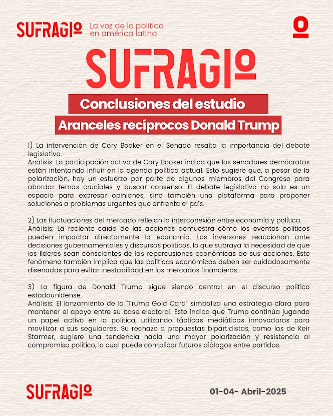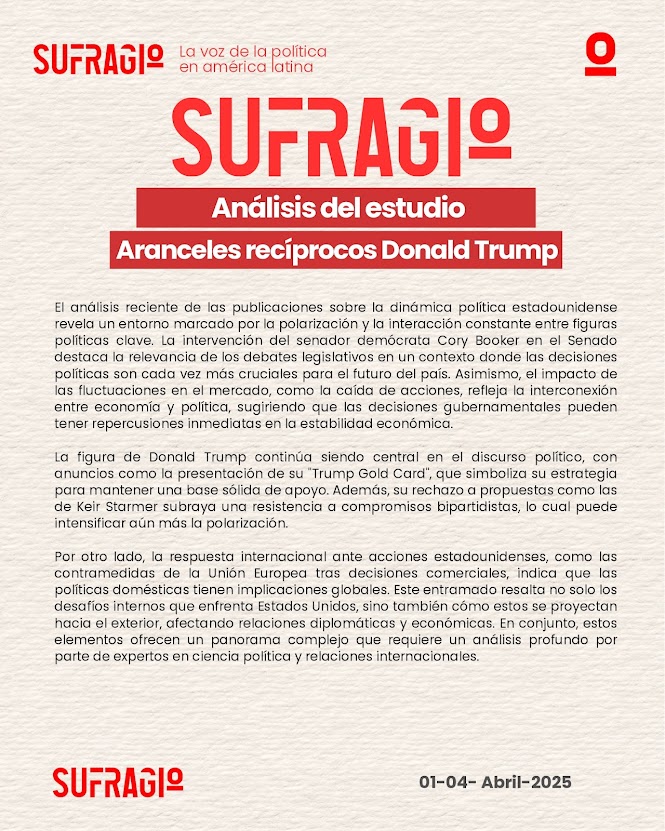 El presente estudio de escucha social se enmarca en un contexto político y comunicacional altamente polarizado en los Estados Unidos. A través del análisis reciente de publicaciones digitales, se identifica una narrativa dominada por figuras clave como el senador demócrata Cory Booker y el expresidente Donald Trump, cuyas intervenciones y estrategias refuerzan la tensión entre bloques ideológicos. La relación entre economía y política se vuelve particularmente evidente ante eventos como la caída bursátil, evidenciando el impacto inmediato de las decisiones gubernamentales. Además, la proyección internacional de estas dinámicas, reflejada en las reacciones de actores como la Unión Europea, subraya la importancia de observar no solo el discurso interno, sino también su resonancia global. Este entorno ofrece una oportunidad clave para comprender cómo se construye, difunde y transforma el debate político a través de las redes sociales.