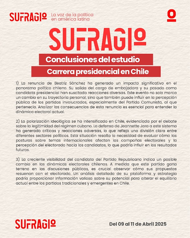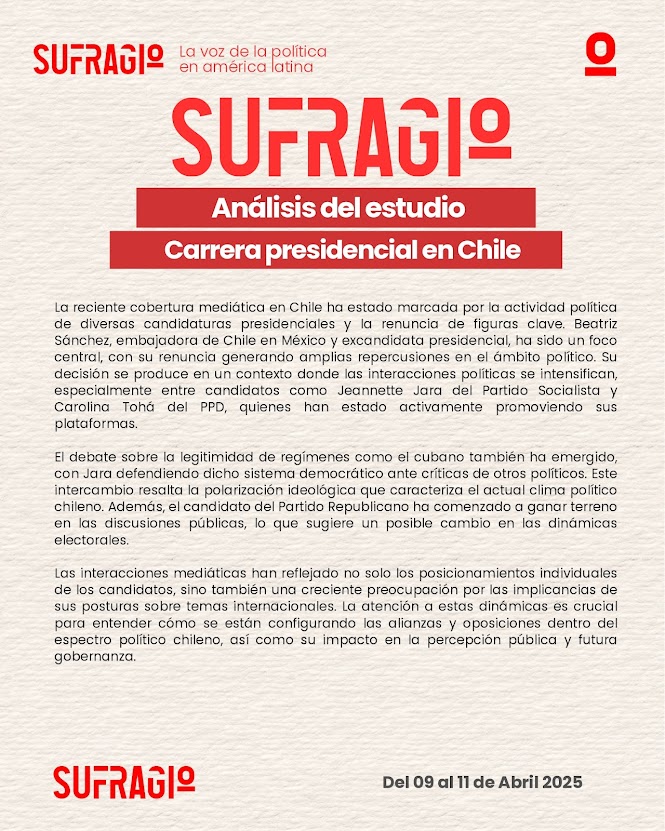 La reciente cobertura mediática en Chile ha estado marcada por la actividad política de diversas candidaturas presidenciales y la renuncia de figuras clave que han sacudido el panorama político del país. Beatriz Sánchez, actual embajadora de Chile en México y excandidata presidencial, se ha convertido en un centro de atención, especialmente tras su renuncia, que ha tenido amplias repercusiones en los círculos políticos. Este evento ocurre en un contexto de creciente dinamismo entre las interacciones políticas, donde figuras como Jeannette Jara, del Partido Socialista, y Carolina Tohá, del PPD, han intensificado la promoción de sus plataformas. Además, el debate sobre la legitimidad de regímenes como el cubano ha irrumpido en el escenario, con Jara defendiendo el sistema democrático cubano frente a las críticas de otros políticos, lo que refleja la polarización ideológica que marca el actual clima político chileno. En este mismo contexto, el candidato del Partido Republicano ha comenzado a ganar relevancia en las discusiones públicas, lo que podría sugerir un cambio significativo en las dinámicas electorales del país.