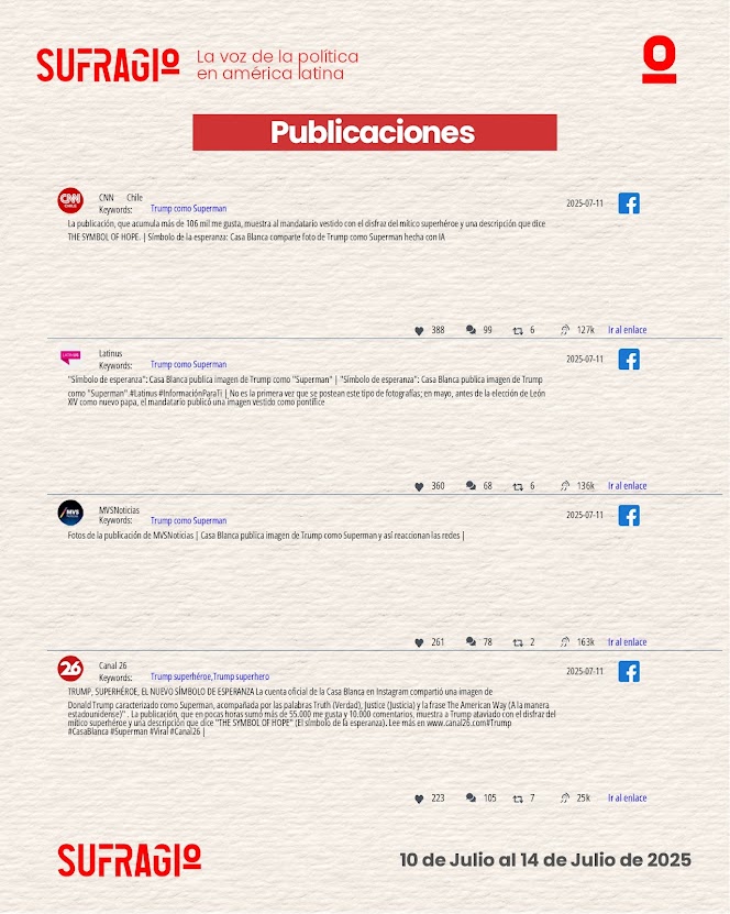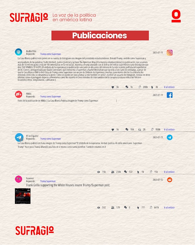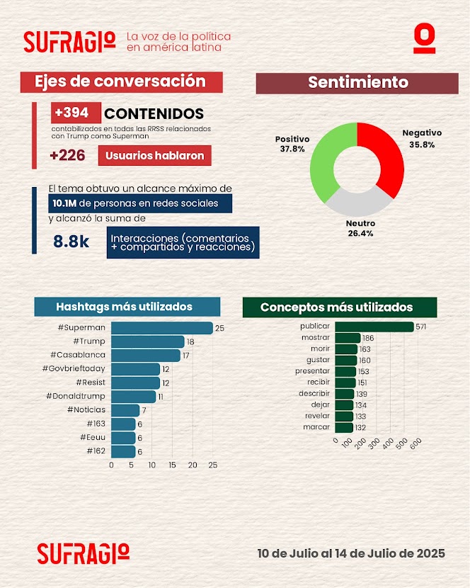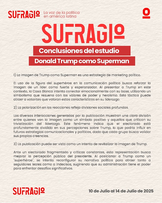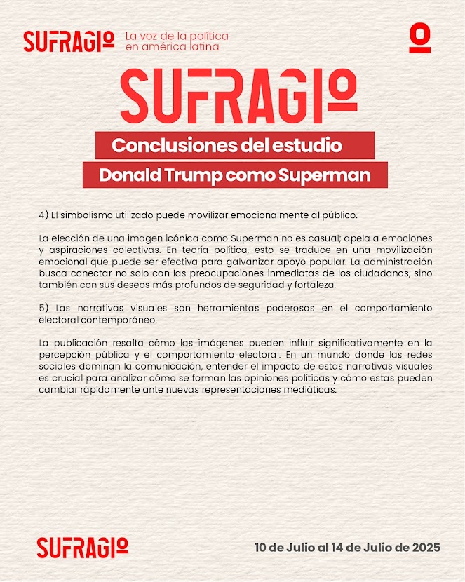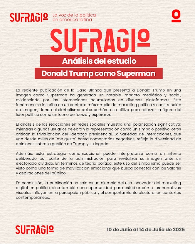 La imagen de Donald Trump caracterizado como Superman, recientemente difundida por canales oficiales de la Casa Blanca, ha desatado un intenso debate público y mediático. Más allá del impacto visual, esta acción revela una sofisticada estrategia de marketing político, en la que el uso del simbolismo heroico busca proyectar al exmandatario como una figura de fuerza, salvación y liderazgo. En un escenario electoral polarizado, esta narrativa visual se convierte en un recurso clave para movilizar emociones, reforzar identidades políticas y disputar la hegemonía simbólica en el espacio digital.
