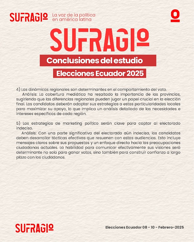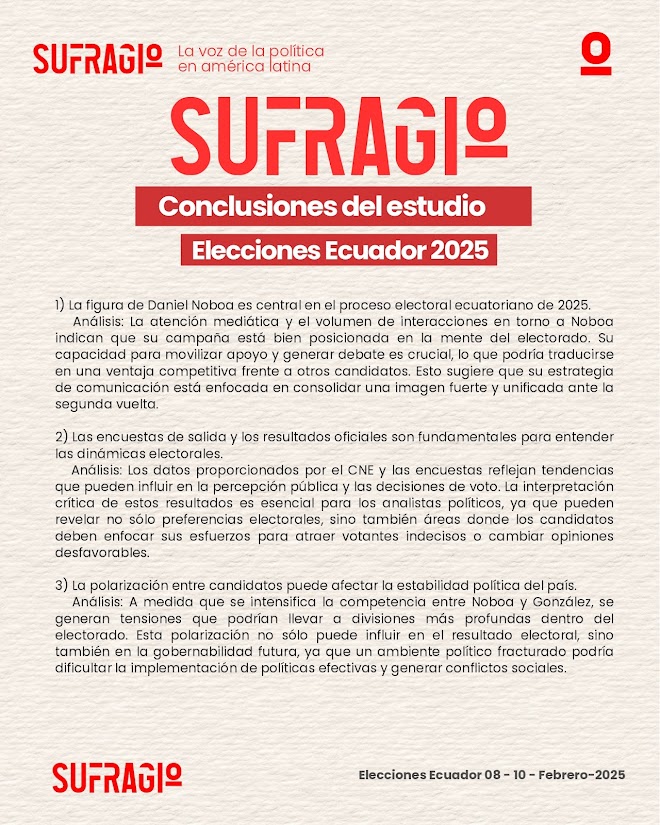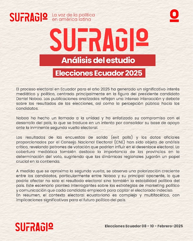 Este estudio destaca la complejidad del proceso electoral ecuatoriano de 2025, marcado por la polarización y el papel decisivo de las dinámicas regionales. El liderazgo de Daniel Noboa, su llamado a la unidad y las estrategias de comunicación política emergen como factores clave en la contienda. Además, el análisis de encuestas y resultados oficiales revela patrones de votación que podrían definir el desenlace electoral, con implicaciones significativas para la estabilidad política y el futuro del país.