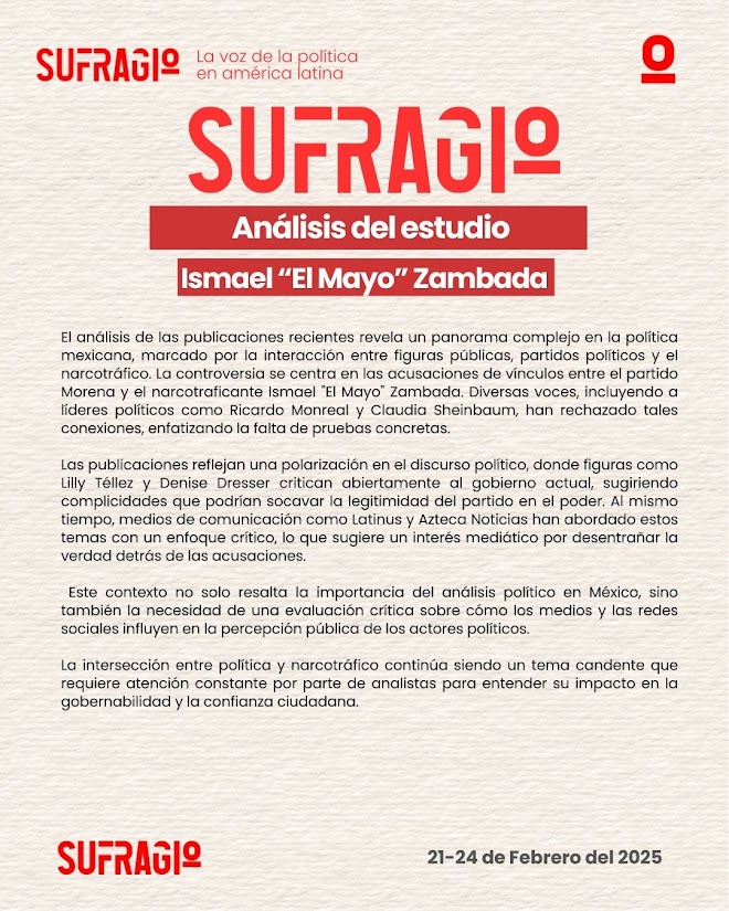 Las recientes acusaciones sobre presuntos vínculos entre diferentes partidos políticos y el narcotraficante Ismael “El Mayo” Zambada han generado un fuerte debate. Líderes han rechazado las acusaciones, mientras que figuras como Lilly Téllez y Denise Dresser las utilizan para cuestionar al gobierno. Medios como Latinus y Azteca Noticias han abordado el tema con un enfoque crítico, reflejando la creciente polarización. La relación entre política y crimen organizado sigue siendo un tema clave para la gobernabilidad y la confianza ciudadana.