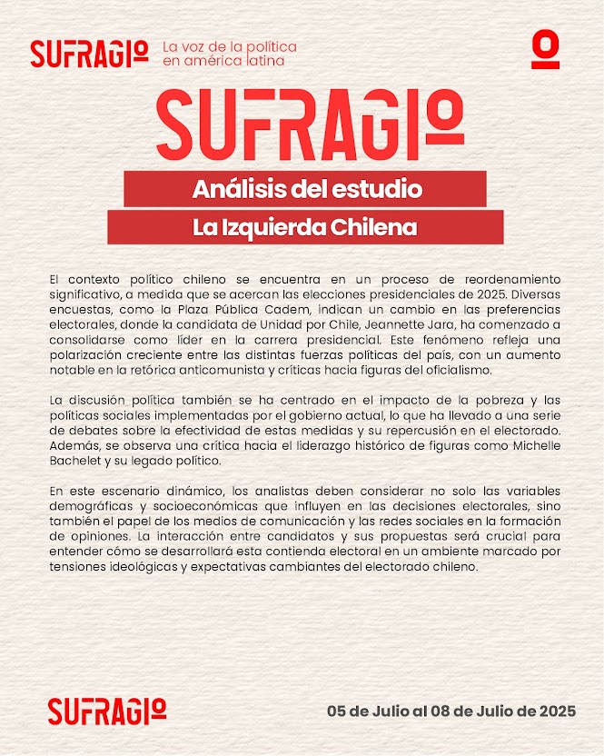 El panorama político chileno se encuentra en plena transformación rumbo a las elecciones presidenciales de 2025. La candidatura de Jeannette Jara, representante de Unidad por Chile, emerge como líder según recientes sondeos, en un contexto marcado por la creciente polarización y el debate sobre el impacto de las políticas sociales del gobierno actual. Este escenario, atravesado por tensiones ideológicas y críticas al legado político tradicional, exige un análisis integral que considere factores socioeconómicos y el papel de los medios en la configuración del voto.