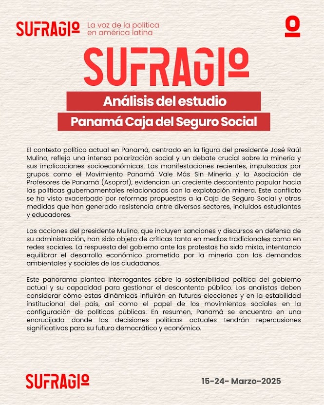 El contexto político de Panamá, bajo la presidencia de José Raúl Mulino, se caracteriza por una creciente polarización social, impulsada por la oposición a las políticas mineras y las reformas a la Caja de Seguro Social. Grupos como el Movimiento Panamá Vale Más Sin Minería y la Asociación de Profesores de Panamá han liderado protestas, reflejando el descontento popular. Las respuestas del gobierno, entre sanciones y defensas públicas, enfrentan el desafío de equilibrar el desarrollo económico con las demandas sociales, lo que plantea dudas sobre la estabilidad política y el futuro democrático del país.