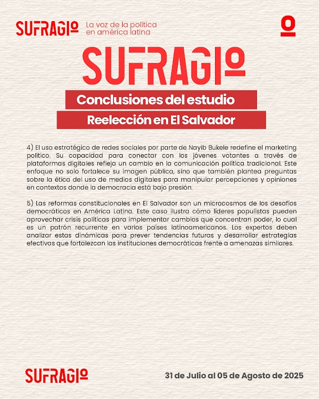 El escenario político de El Salvador bajo el liderazgo de Nayib Bukele ha reconfigurado los marcos tradicionales de la democracia en América Latina. Las reformas constitucionales impulsadas durante su mandato, particularmente la habilitación de la reelección presidencial indefinida, han provocado una ola de reacciones tanto dentro como fuera del país, alimentando un debate crucial sobre los límites del poder, el papel de las instituciones y la salud del sistema democrático. A esto se suma una estrategia comunicacional sin precedentes, centrada en el uso intensivo de redes sociales, que ha permitido al mandatario salvadoreño posicionarse como un líder moderno y disruptivo ante una ciudadanía joven y conectada, pero que al mismo tiempo ha despertado alertas por su carácter propagandístico y polarizante. Este contexto ofrece un caso de estudio fundamental para comprender las tensiones actuales entre gobernabilidad, populismo digital y presión internacional en América Latina.