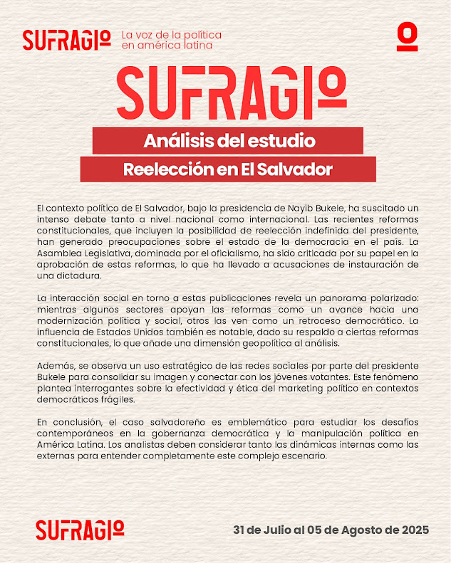 El escenario político de El Salvador bajo el liderazgo de Nayib Bukele ha reconfigurado los marcos tradicionales de la democracia en América Latina. Las reformas constitucionales impulsadas durante su mandato, particularmente la habilitación de la reelección presidencial indefinida, han provocado una ola de reacciones tanto dentro como fuera del país, alimentando un debate crucial sobre los límites del poder, el papel de las instituciones y la salud del sistema democrático. A esto se suma una estrategia comunicacional sin precedentes, centrada en el uso intensivo de redes sociales, que ha permitido al mandatario salvadoreño posicionarse como un líder moderno y disruptivo ante una ciudadanía joven y conectada, pero que al mismo tiempo ha despertado alertas por su carácter propagandístico y polarizante. Este contexto ofrece un caso de estudio fundamental para comprender las tensiones actuales entre gobernabilidad, populismo digital y presión internacional en América Latina.