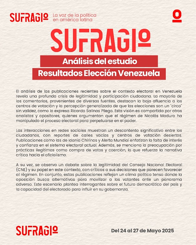 El reciente proceso electoral en Venezuela ha sido objeto de múltiples críticas y análisis que evidencian una profunda crisis de legitimidad. Las publicaciones más recientes en redes sociales y medios independientes revelan un panorama desolador: centros de votación vacíos, denuncias de manipulación y un clima generalizado de apatía ciudadana. La percepción predominante es que se trata de una farsa electoral impulsada por el régimen de Nicolás Maduro, lo que ha encendido el debate sobre el futuro democrático del país.