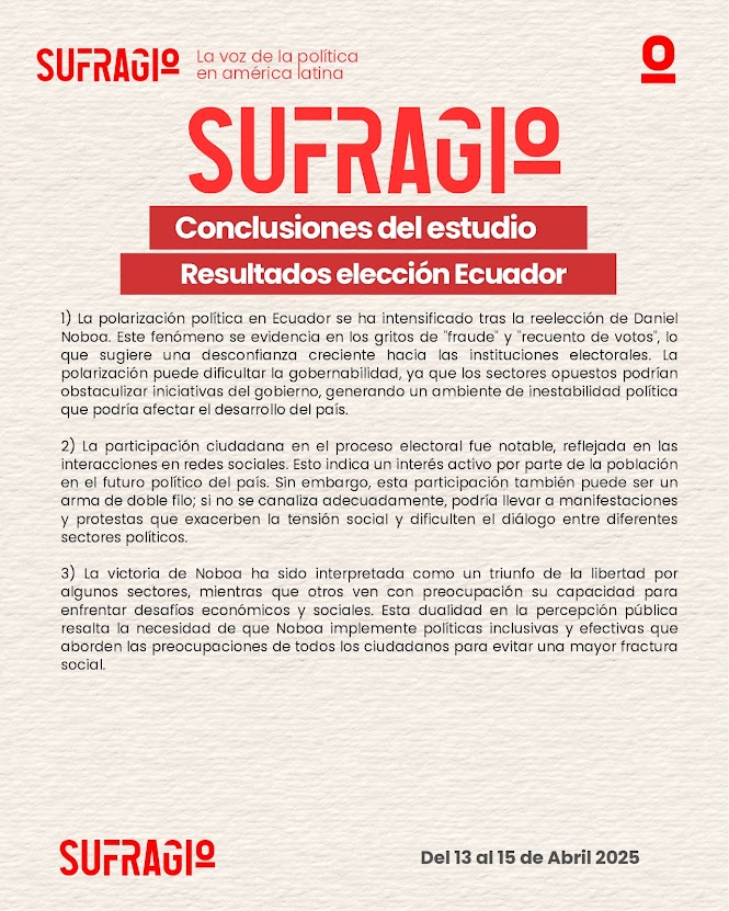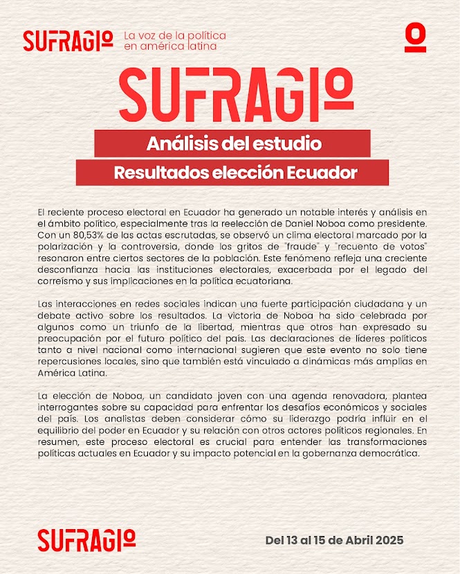 El reciente proceso electoral en Ecuador ha captado la atención regional por su intensidad y sus implicaciones políticas, marcadas por la reelección de Daniel Noboa en un clima de polarización y desconfianza institucional. Con más del 80% de actas escrutadas, las denuncias de fraude y las tensiones postelectorales evidencian una ciudadanía activa, dividida entre la esperanza en un liderazgo renovador y la incertidumbre sobre el rumbo del país. Este escenario invita a un análisis profundo sobre el futuro político de Ecuador y su papel en el contexto latinoamericano.